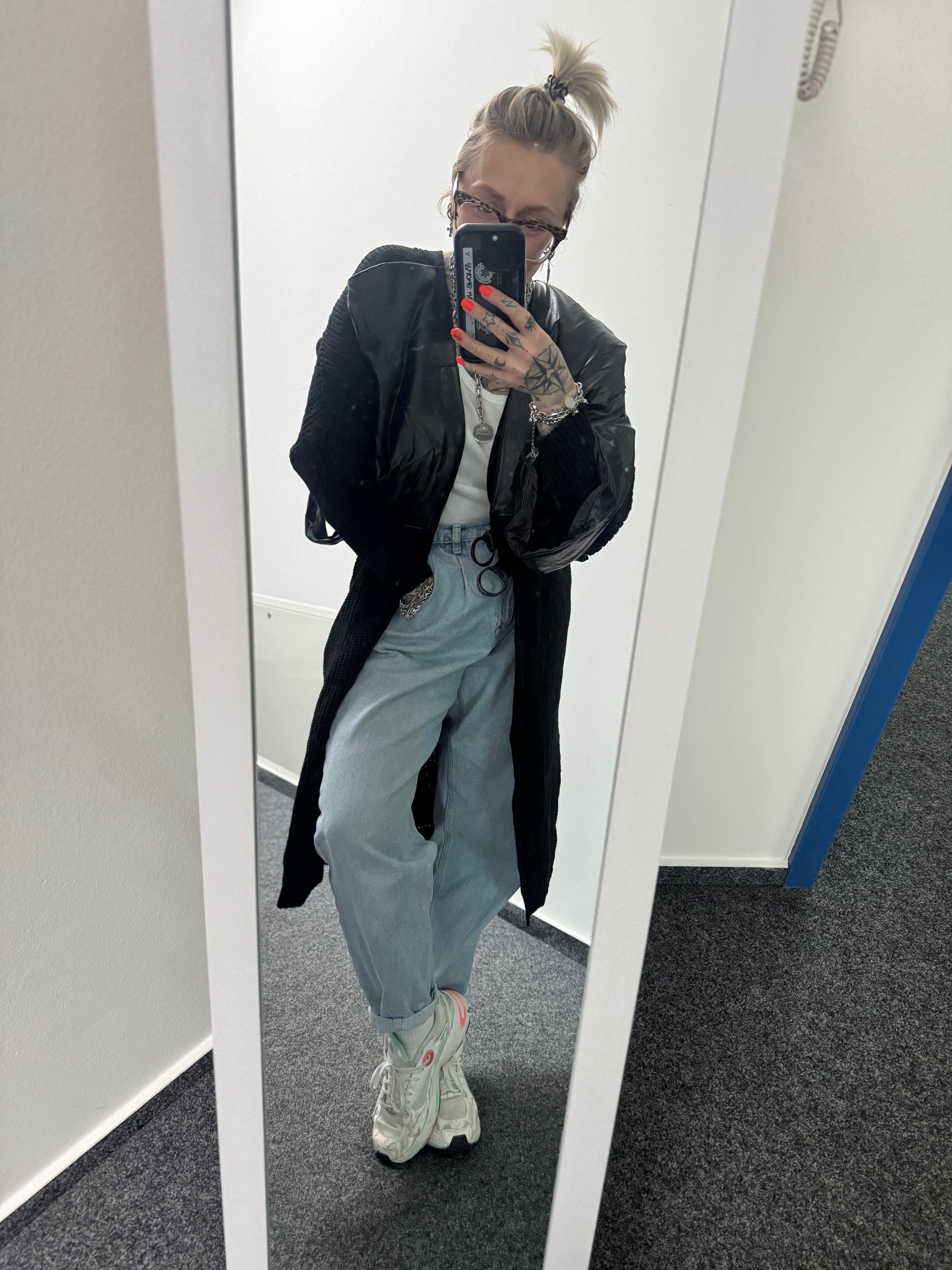 Stylingtechnisch ist er super vielseitig. Zu einer Leder-Leggings wird’s richtig edgy. Zu einer schwarzen Jeans clean und cool. Und zu einer hellen Jeans – wie ich ihn trage – bekommt das Ganze direkt so einen modernen Kontrastlook.