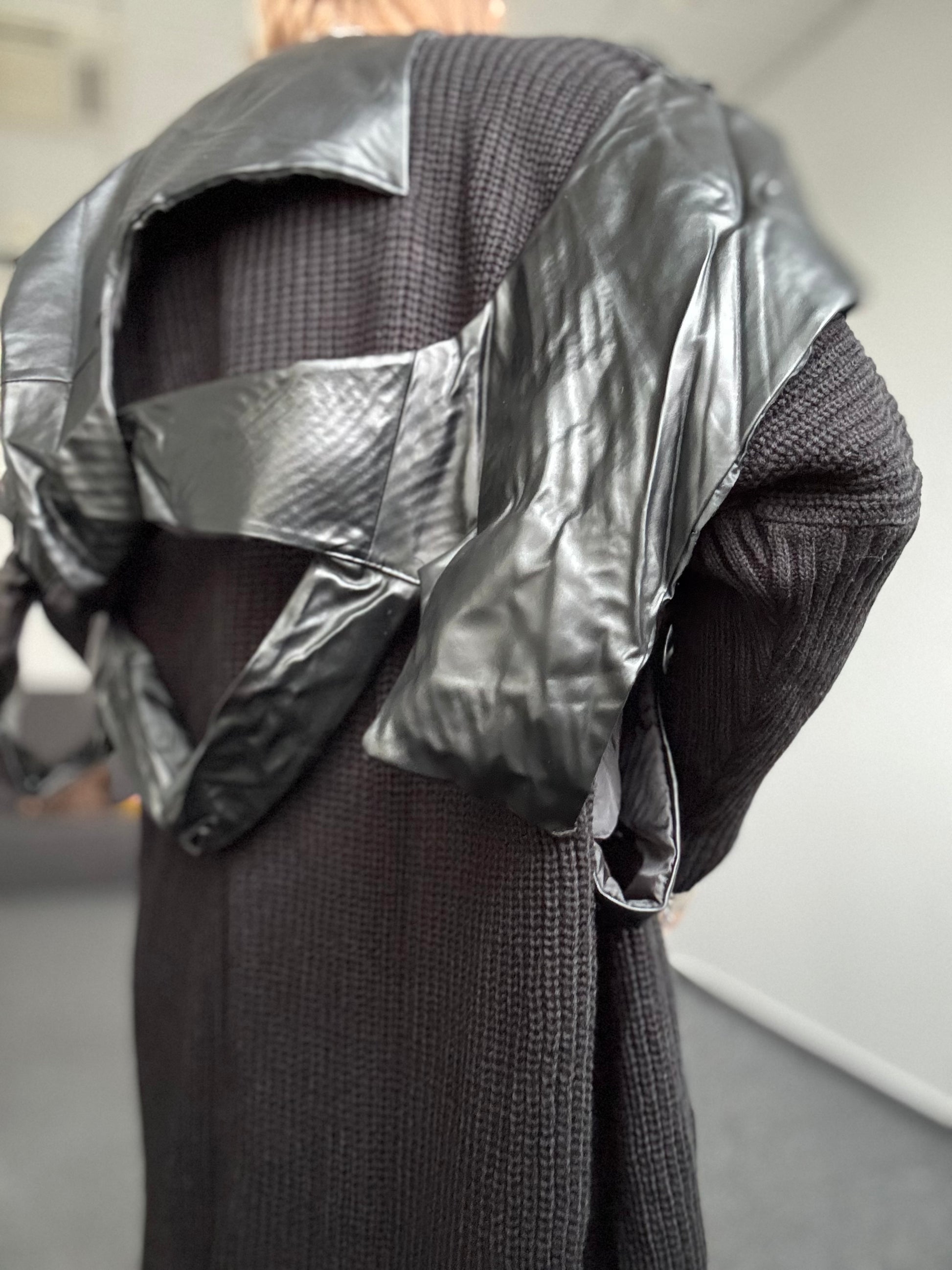Die Kunstleder-Elemente liegen wie ein außergewöhnliches, fast skulpturales Detail über den Schultern und Rücken. Dadurch bekommt der Cardigan eine richtig besondere Silhouette, die je nach Outfit komplett anders wirken kann. Du kannst ihn locker offen tragen, lässig überwerfen oder deinen eigenen Stil finden. Probier dich ruhig aus – das ist ein Teil, mit dem man spielen kann.