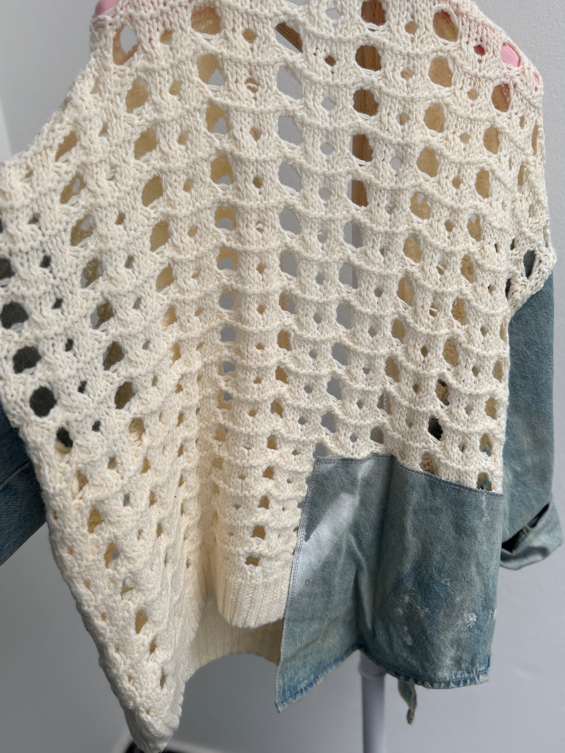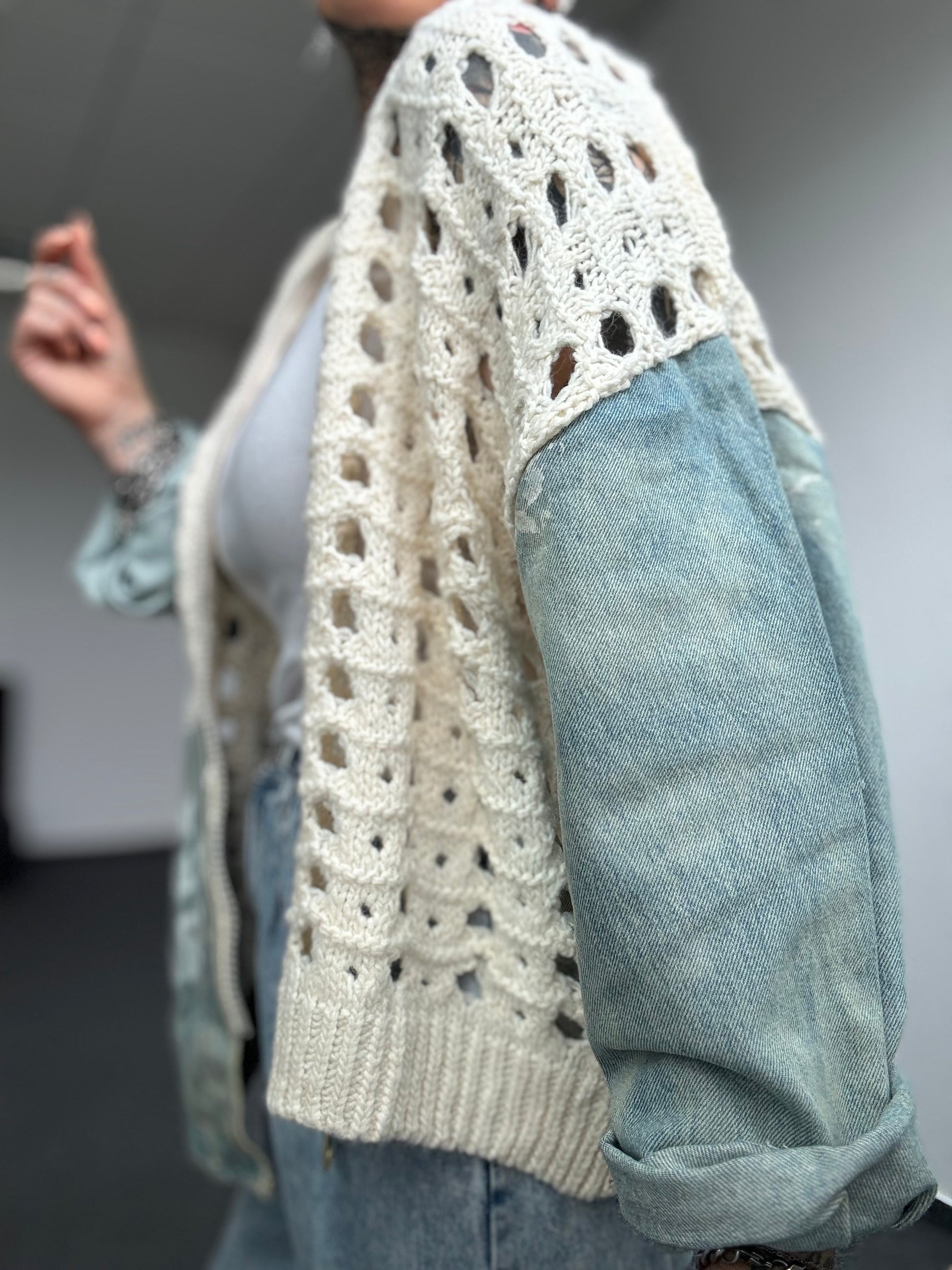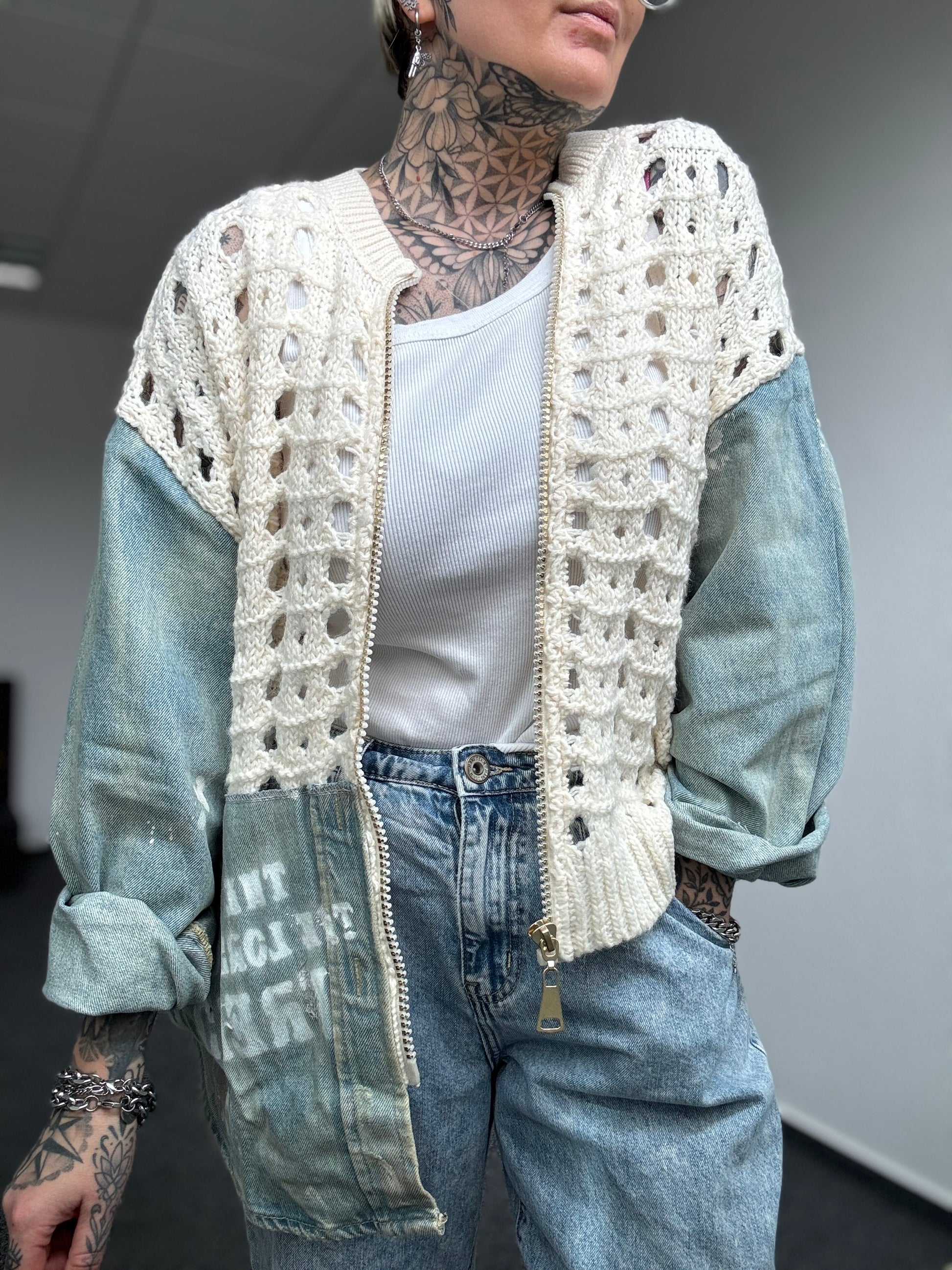Diese Jacke ist ein echtes Statement-Piece! Ein Mix aus grobem Strick und robustem Jeansstoff macht sie zu einem absoluten Hingucker. Die asymmetrische Schnittführung am Saum, kombiniert mit den Jeans-Ärmeln und bemalten Denim-Details, sorgt dafür, dass jedes Teil ein Unikat ist –> keine Jacke gleicht der anderen!!!!!