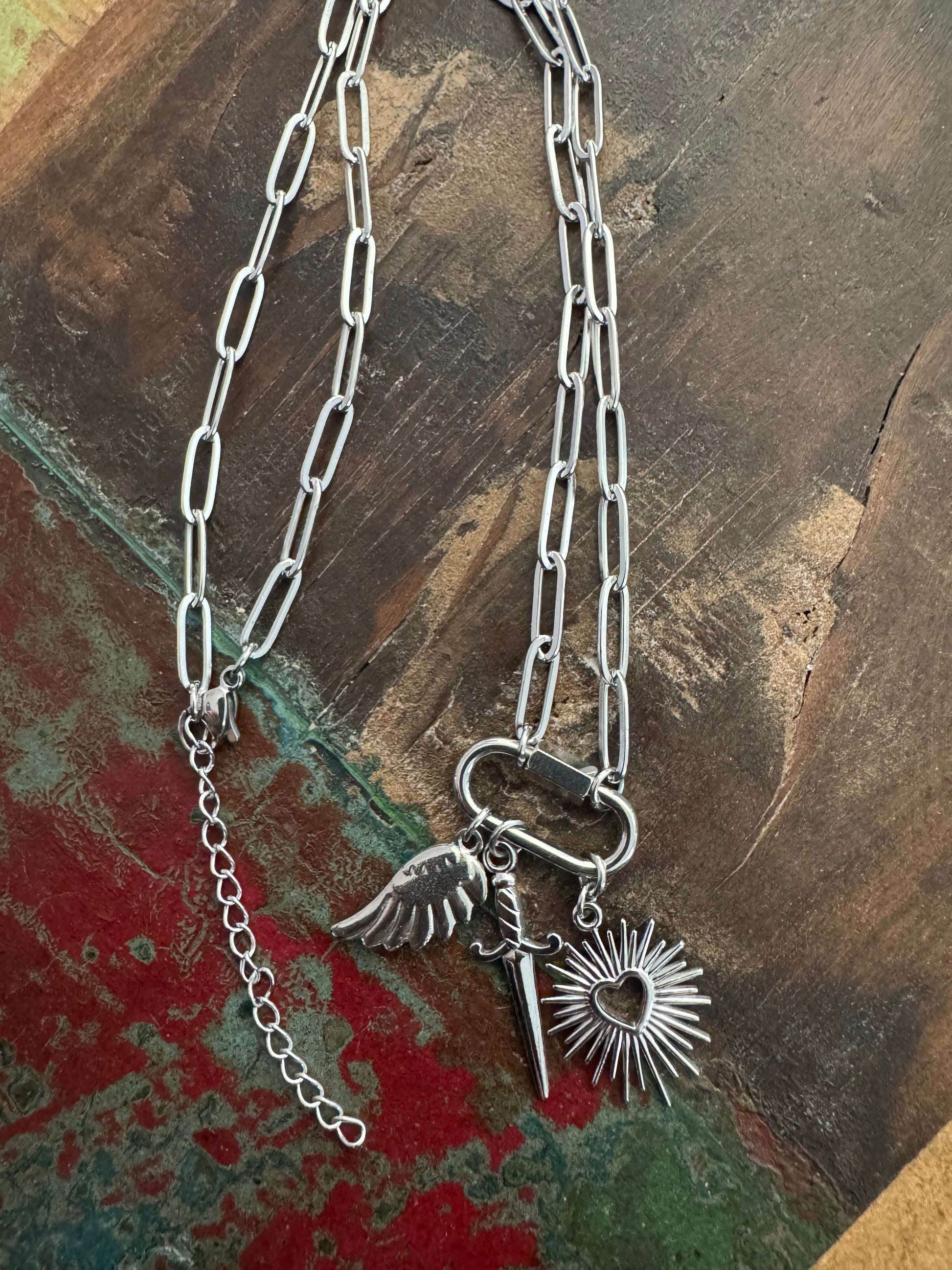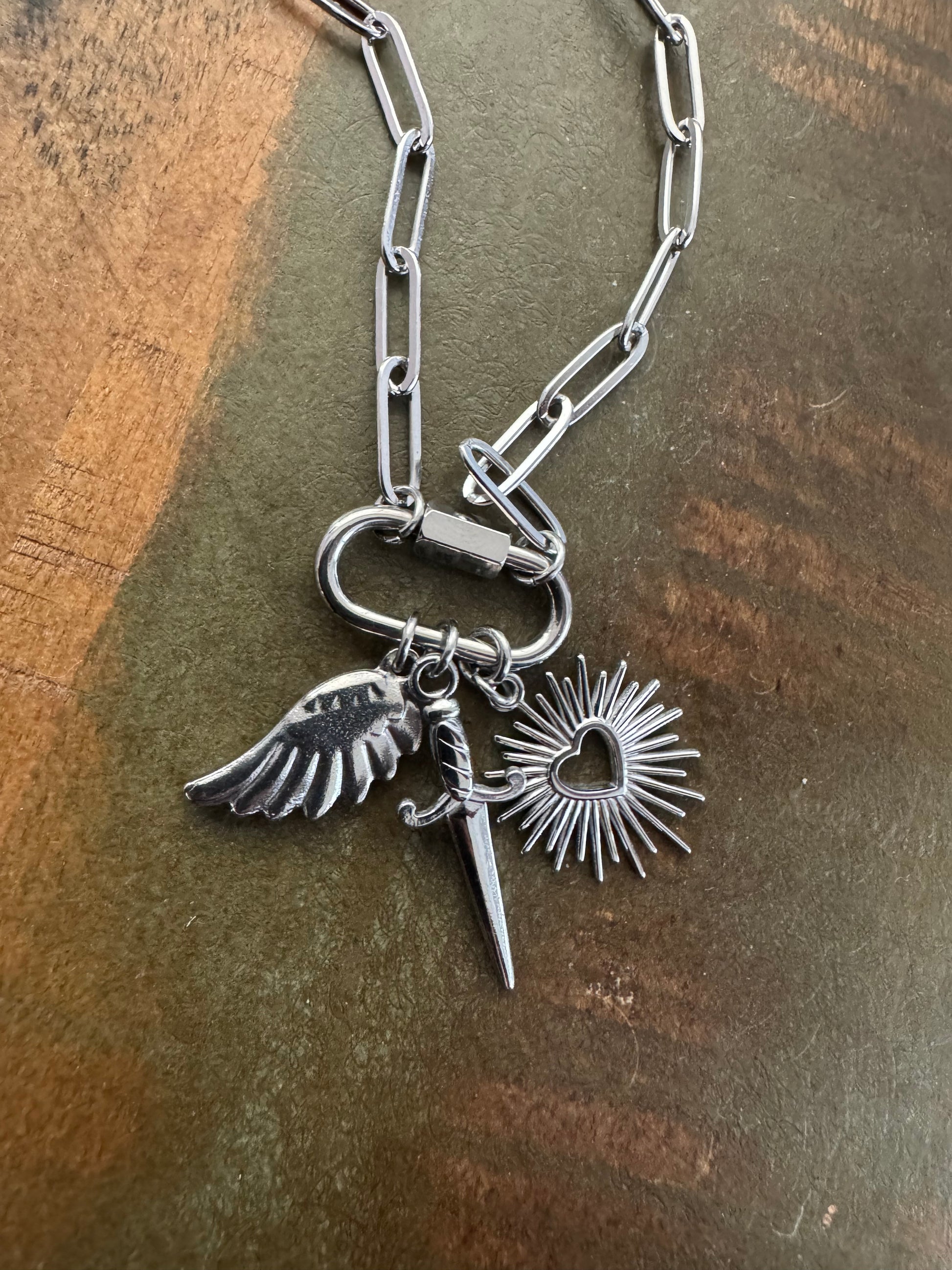 Diese größenverstellbare Edelstahlkette von 48 bis 53 cm trägt drei frei wechselbare Charms, die jeweils für sich sprechen und zusammen eine tiefe Geschichte erzählen.