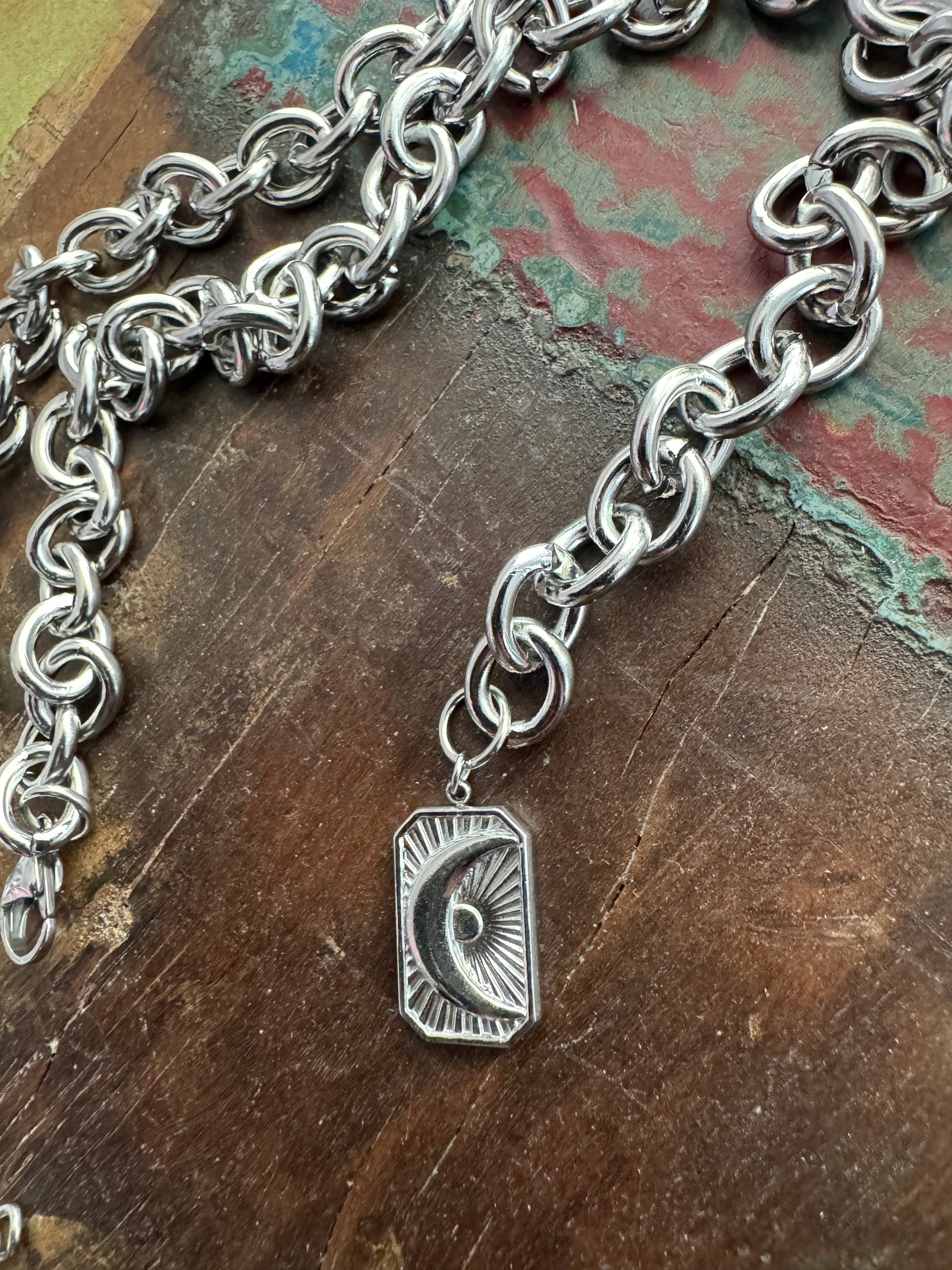 Diese Edelstahlkette ist kein zartes Schmuckstück. Sie ist präsent. Eine große, derbe Gliederkette, die bewusst nur als Y-Kette getragen wird.