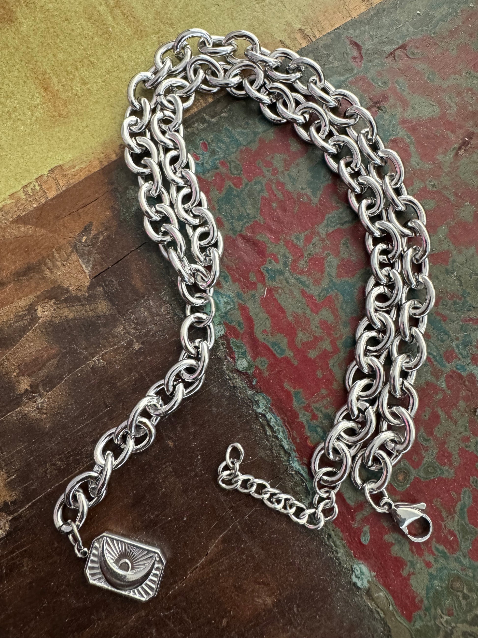Gefertigt ist die Kette aus hochwertigem Edelstahl. Robust, langlebig und gemacht für den Alltag.