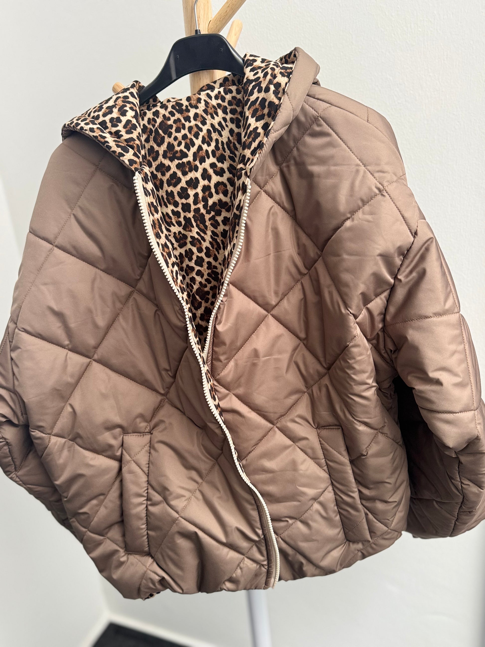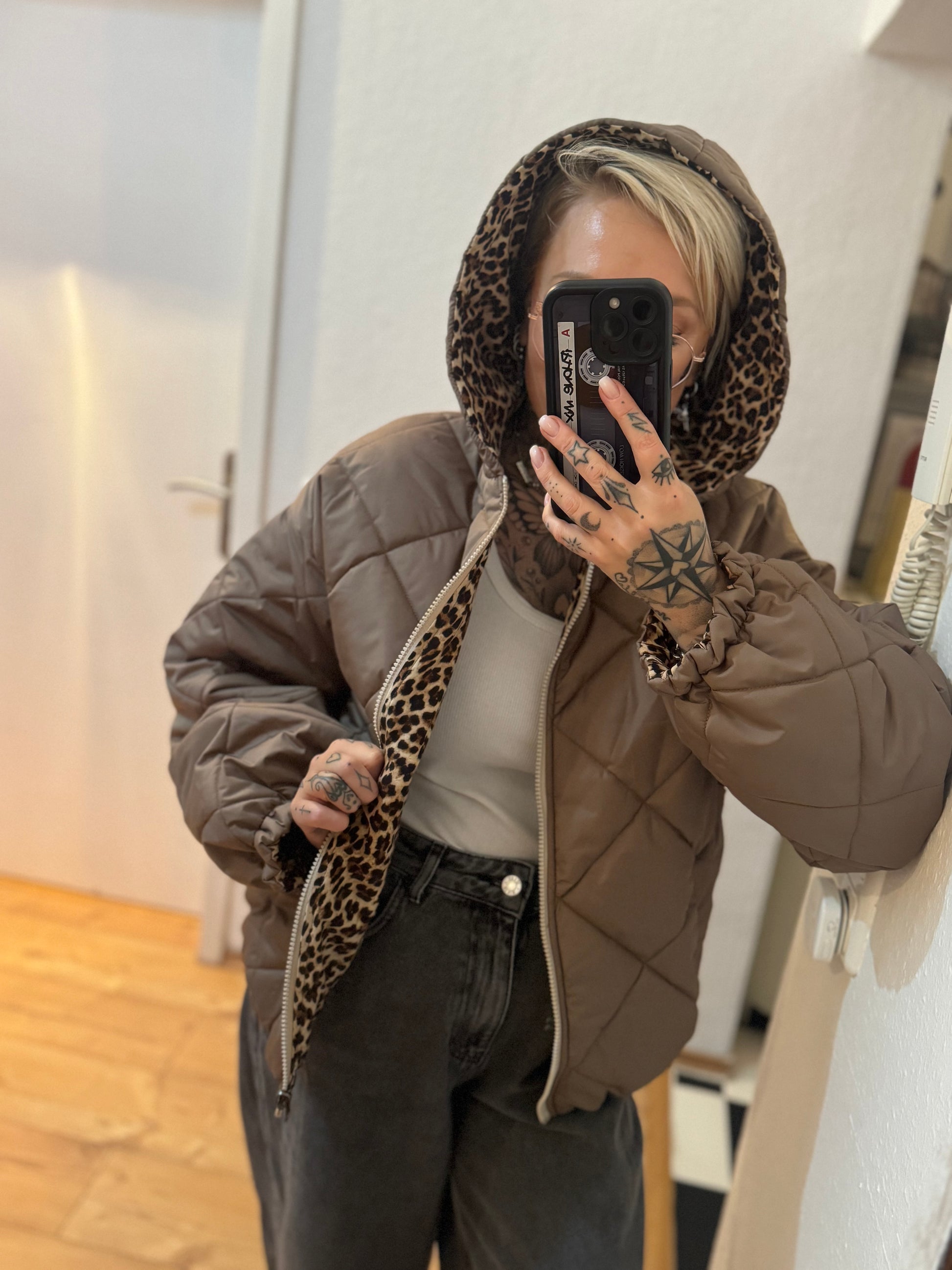 Auf der einen Seite clean und classy im soften Taupe-Ton mit praktischen Seitentaschen. Drehst du sie um, kommt Leo all over, richtig Statement! (Kleiner Hinweis: auf der Leo-Seite gibt’s keine Taschen).