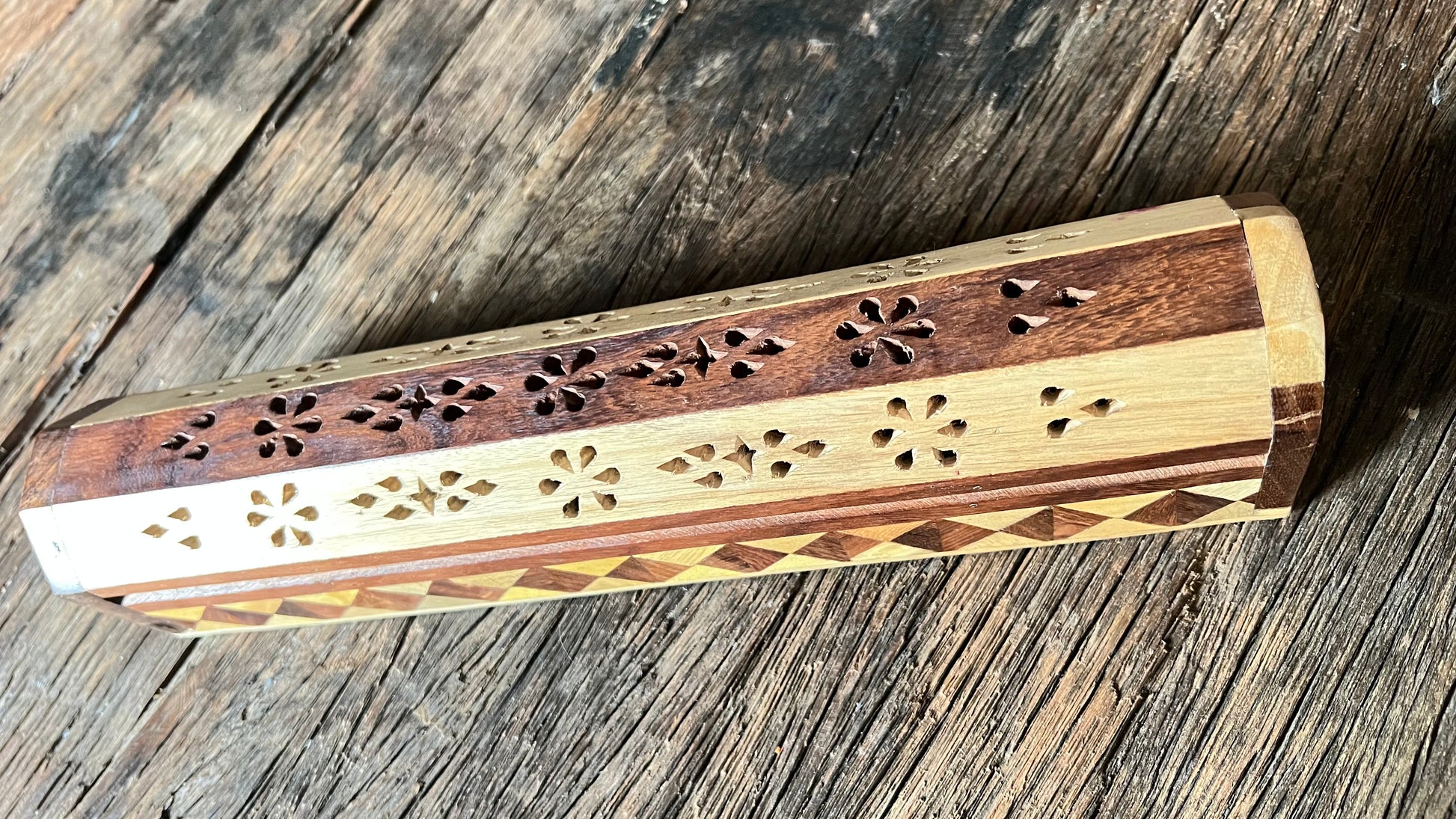 Ich bin sehr glücklich diese tolle Holzbox gefunden zu haben. Ihr könnt Räucherkegel und auch Räucherstäbchen hier verräuchern.