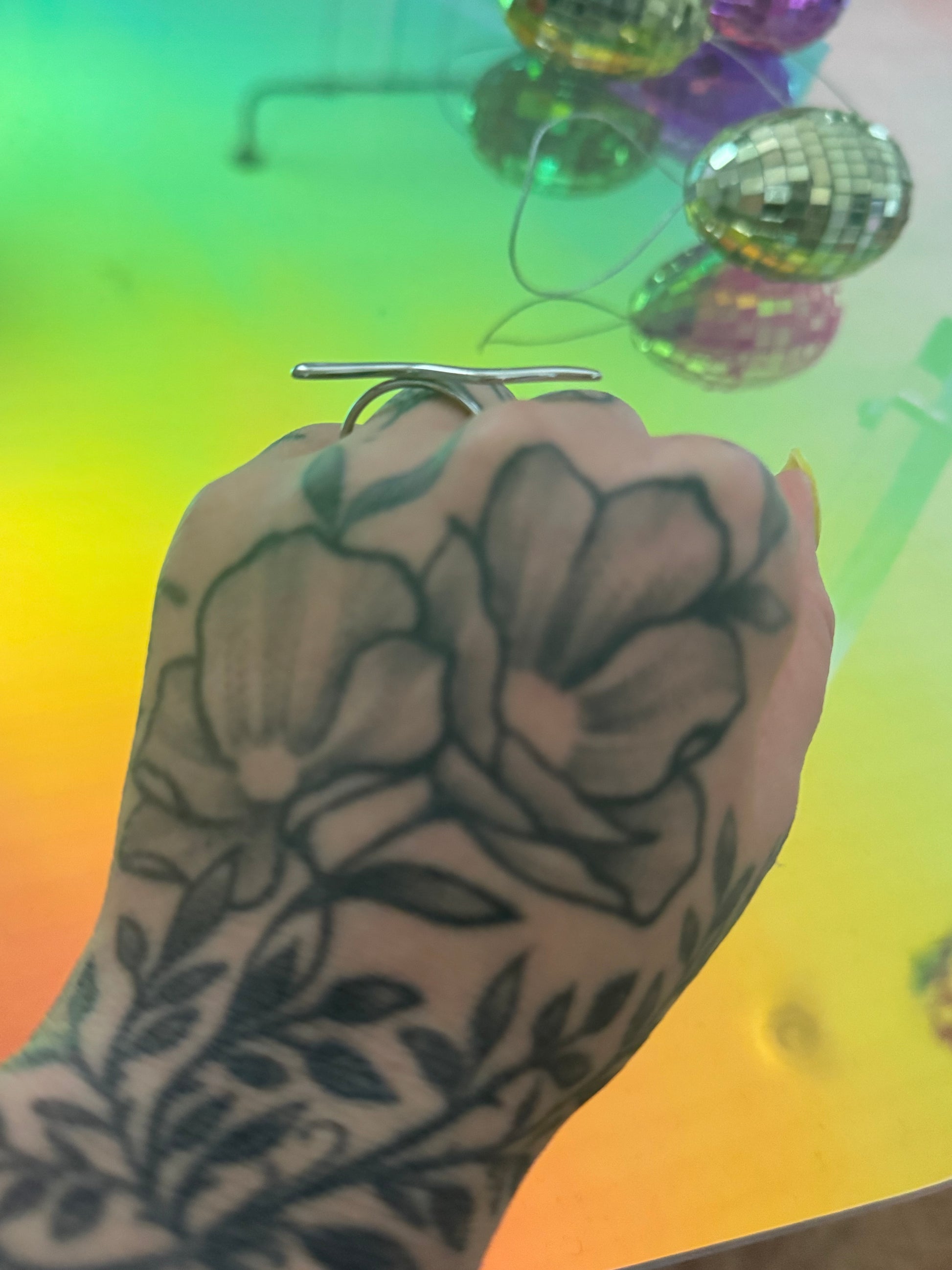 Der Ring ist aus Edelstahl und hat einen Ringdurchmesser von 1,75cm. Der obere Teil hat eine Länge von 4cm.