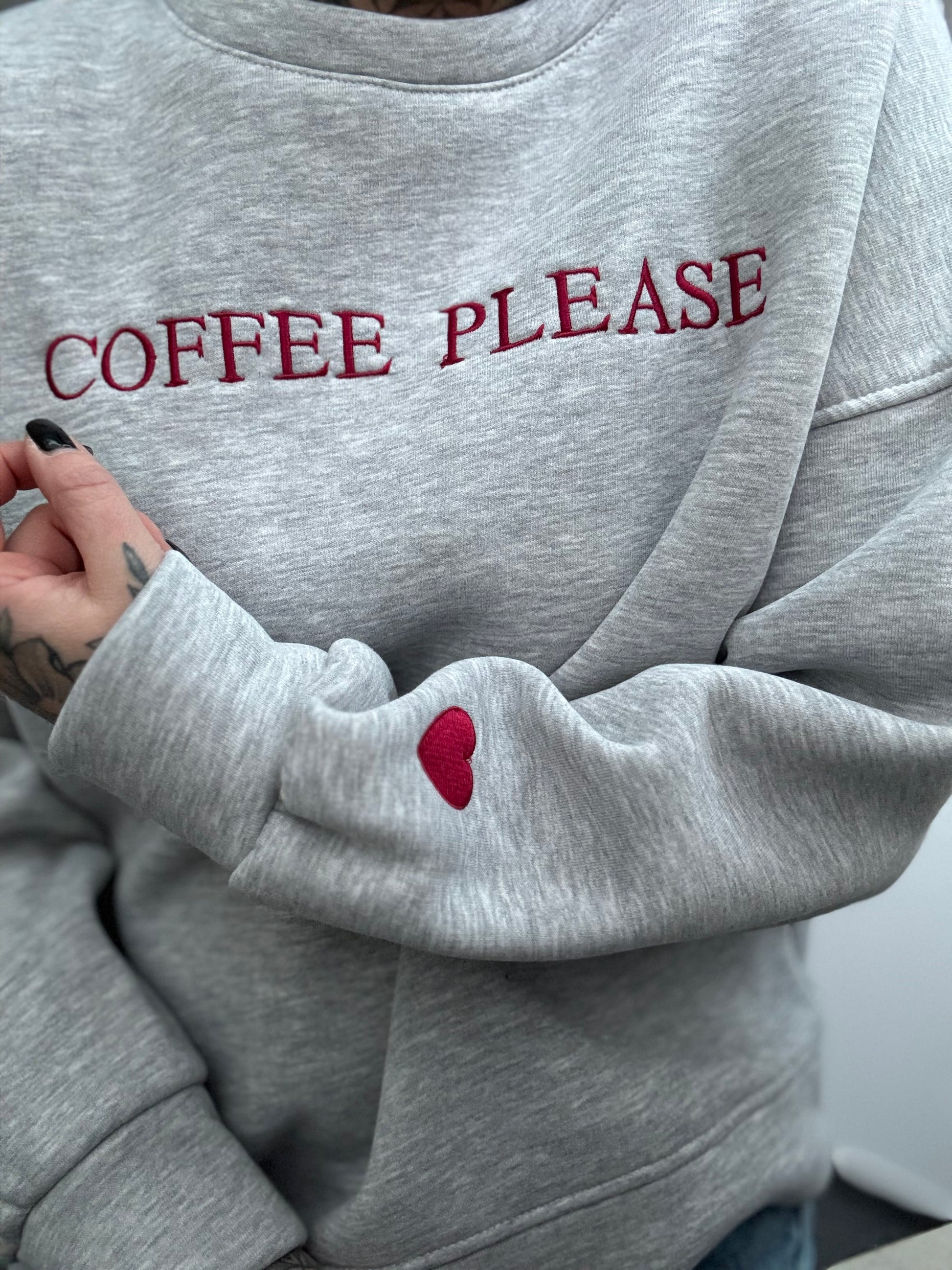 Dieser Sweater ist ein echtes Wohlfühlteil für die kalte Jahreszeit. Ich lieb ja genau dieses helle grau! Vorne auf der Brust steht „Coffee Please“ in roter Stickerei. Auf dem linken Ärmel sitzt ein kleines rotes Herz, ebenfalls gestickt. Dezentes Detail, aber so süss.