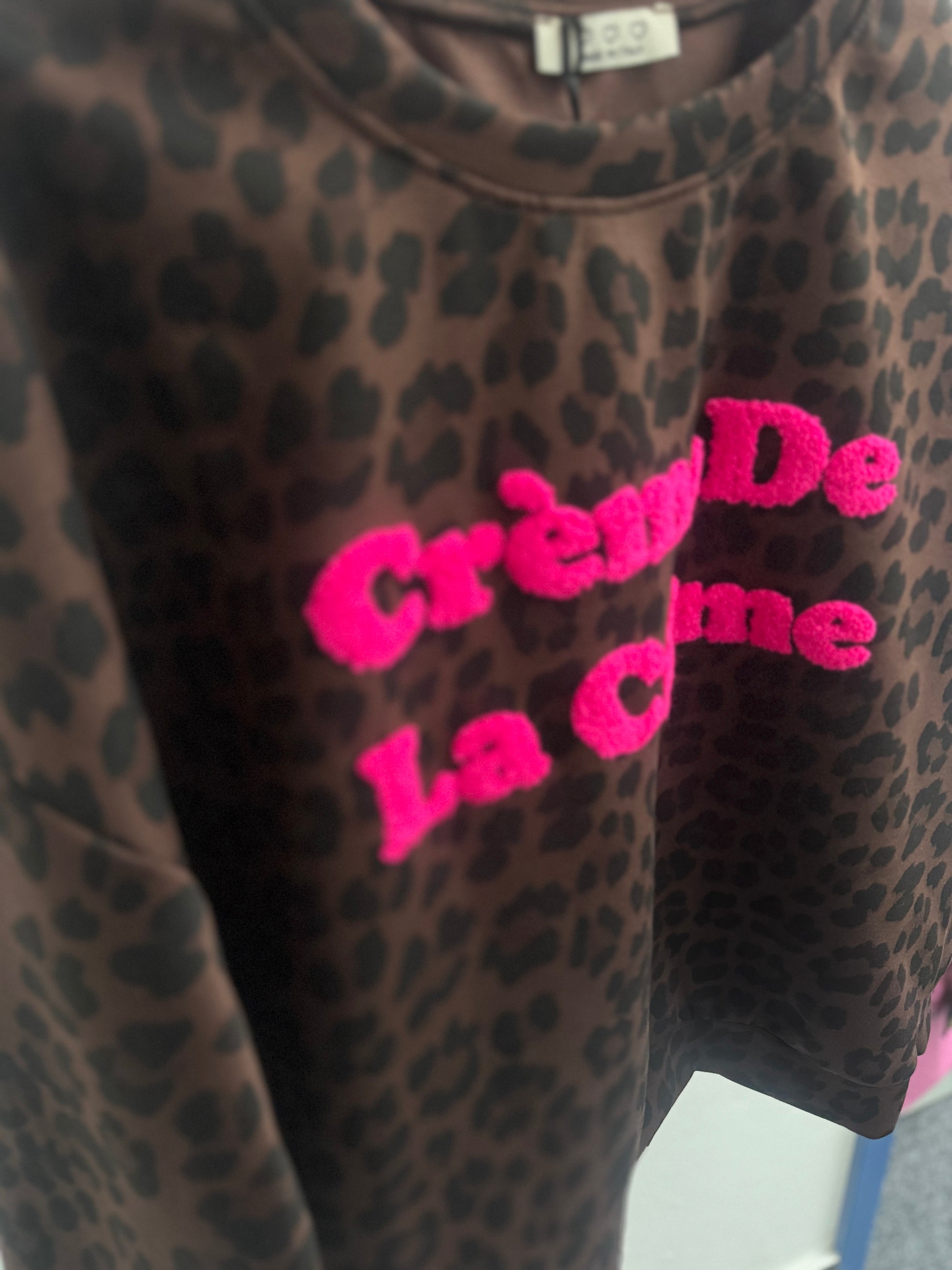 Der Crème De La Crème Sweater ist ein richtiges Statement-Piece! Er kommt im coolen Leo-Muster und hat vorne einen geflockten 3D-Schriftzug in einem richtig knalligen Pink … auf den Bildern wirkt es fast zu brav, in echt knallt es richtig. Ein absoluter Hingucker!