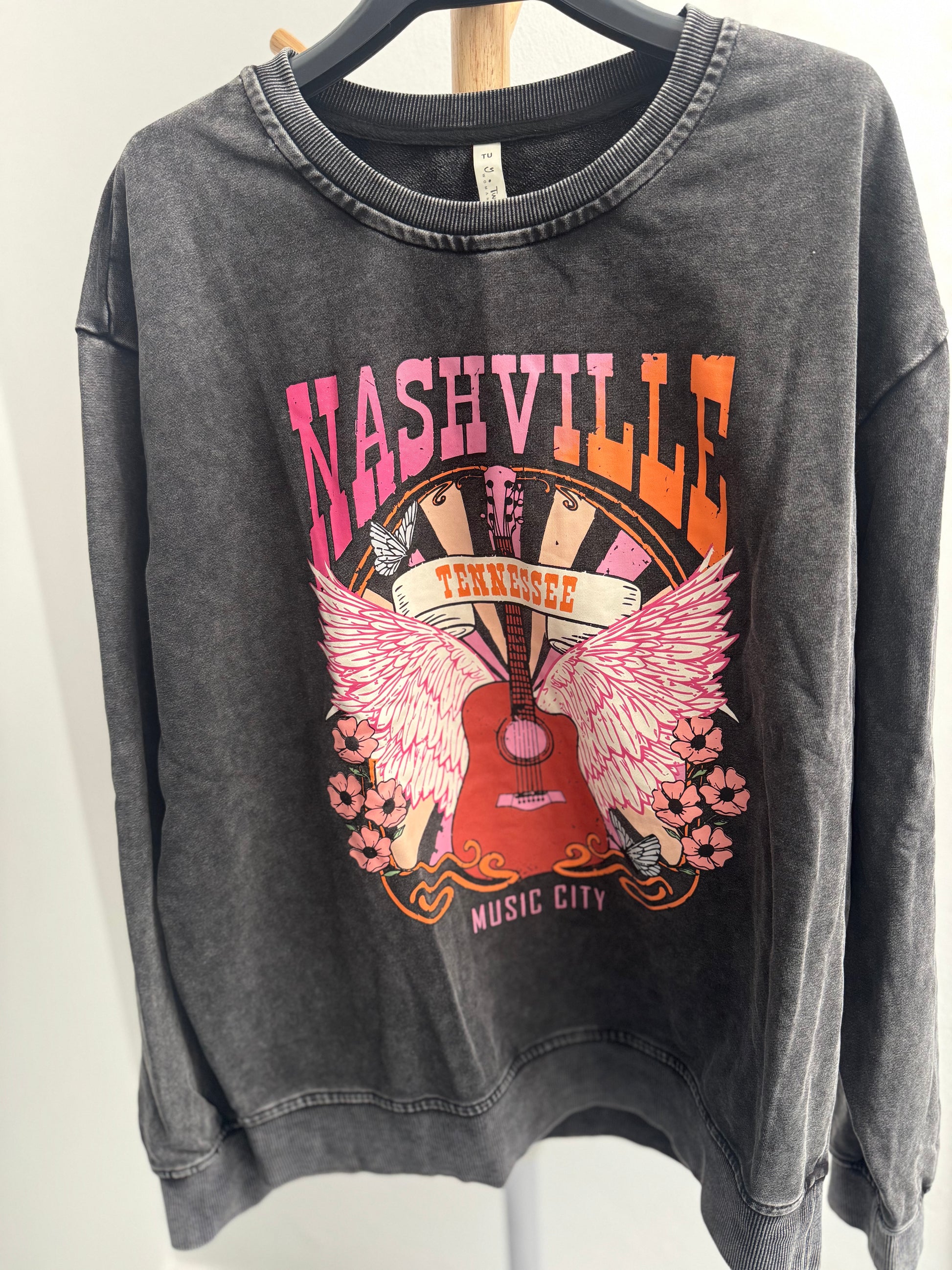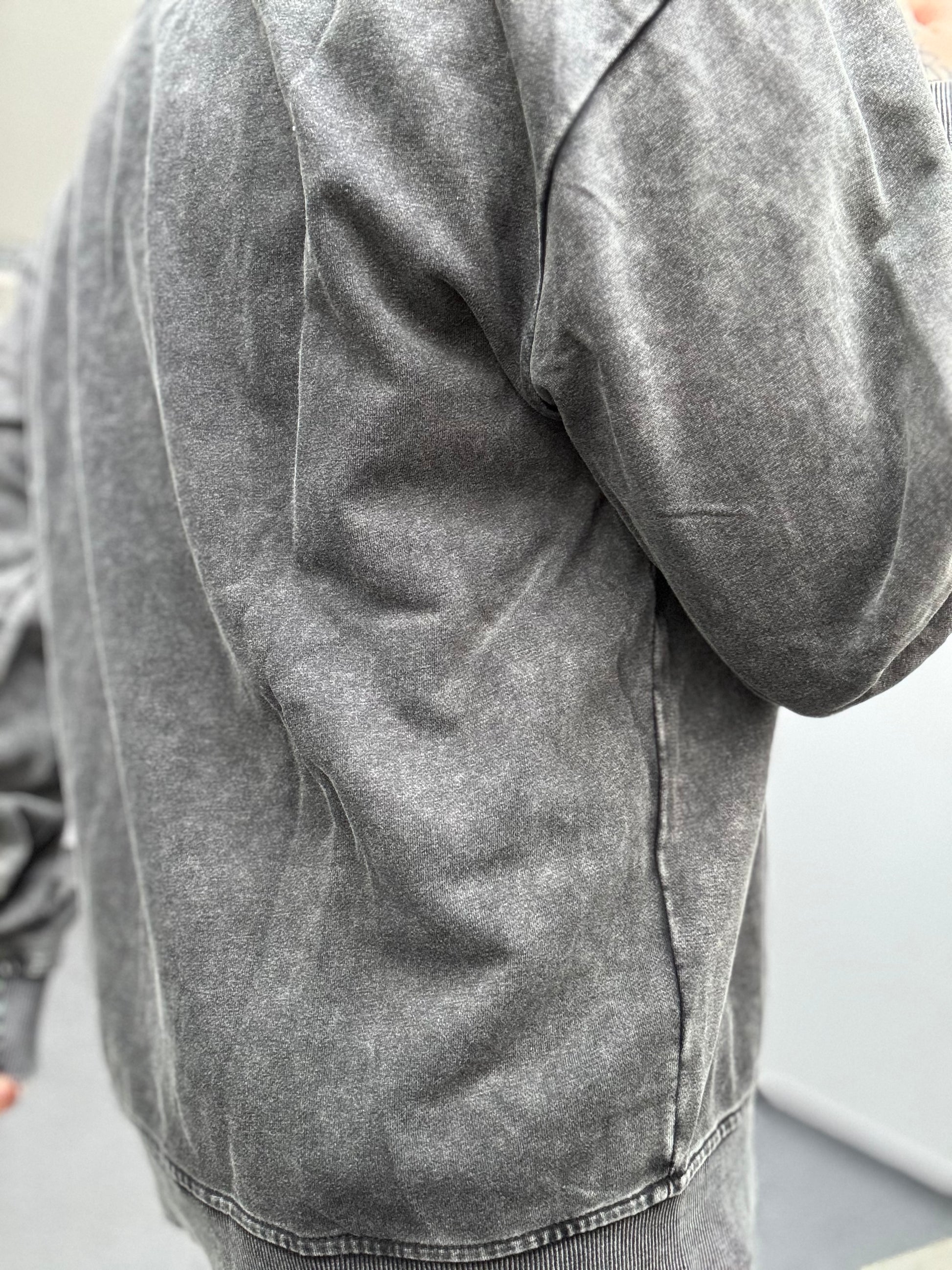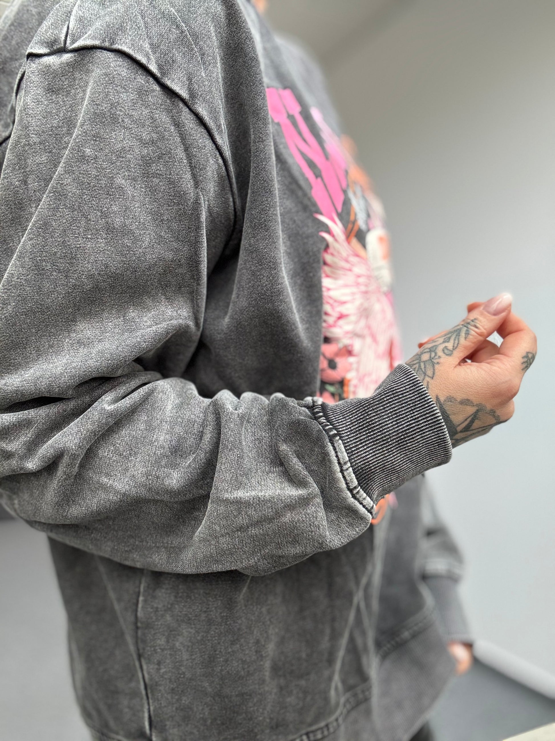Die Farbe ist ein ausgewaschenes Anthrazit-Grau – wirkt schön vintage und lässt sich easy mit Jeans oder Lederleggings stylen. Der Schnitt: überschnittene Ärmel für den lässigen Vibe, aber insgesamt nicht zu oversized. Ich würde sagen, passt super von XS bis M, eine kleine L geht auch –> check einfach die Maße, wenn du unsicher bist.