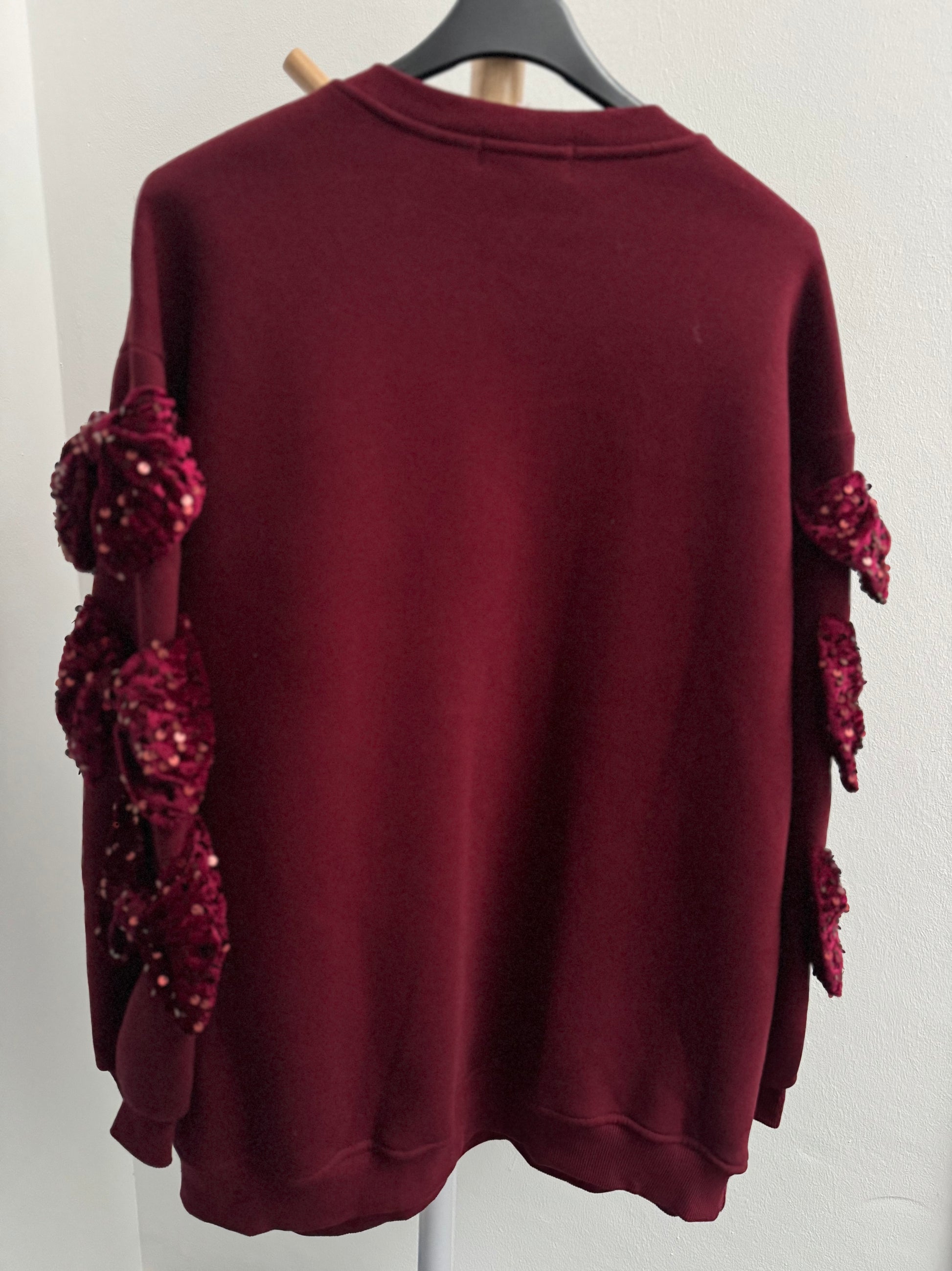 Auf jedem Ärmel sitzen drei große Samtschleifen, komplett mit glitzernden Pailletten. Ein echter Hingucker, feminin, edel und trotzdem absolut cozy.