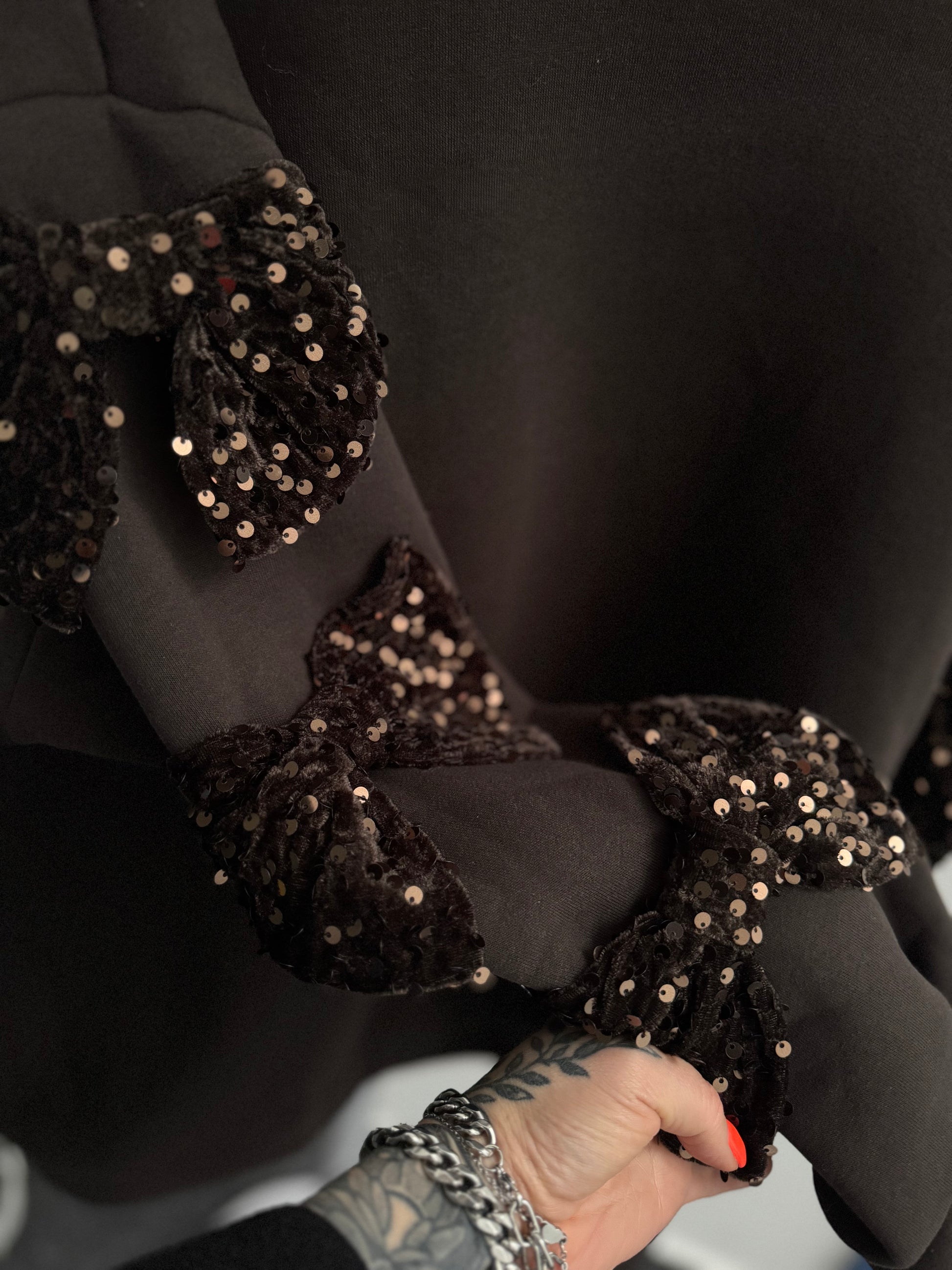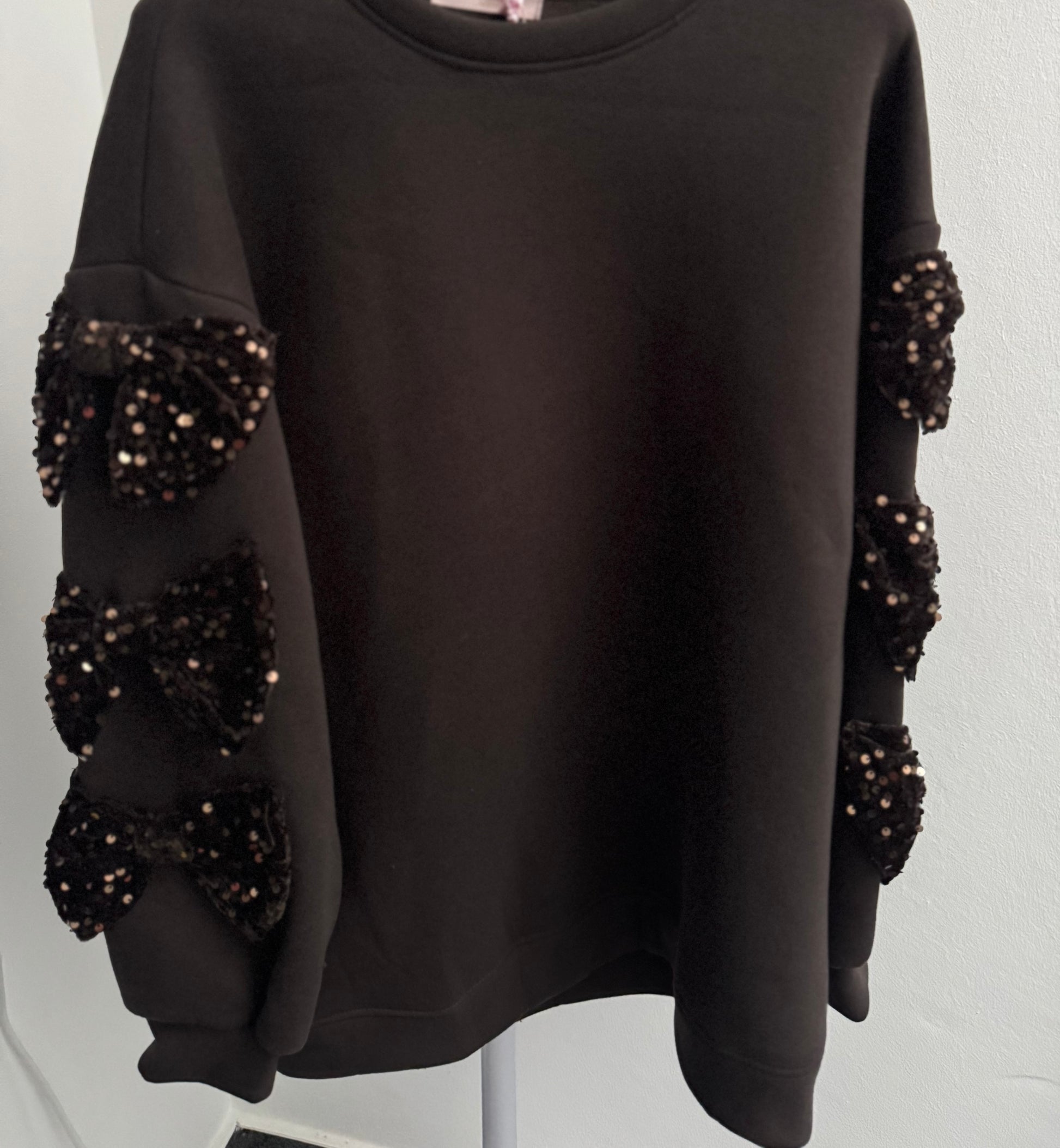 Auf jedem Ärmel sitzen drei große Samtschleifen, komplett mit glitzernden Pailletten. Ein echter Hingucker, feminin, edel und trotzdem absolut cozy.
