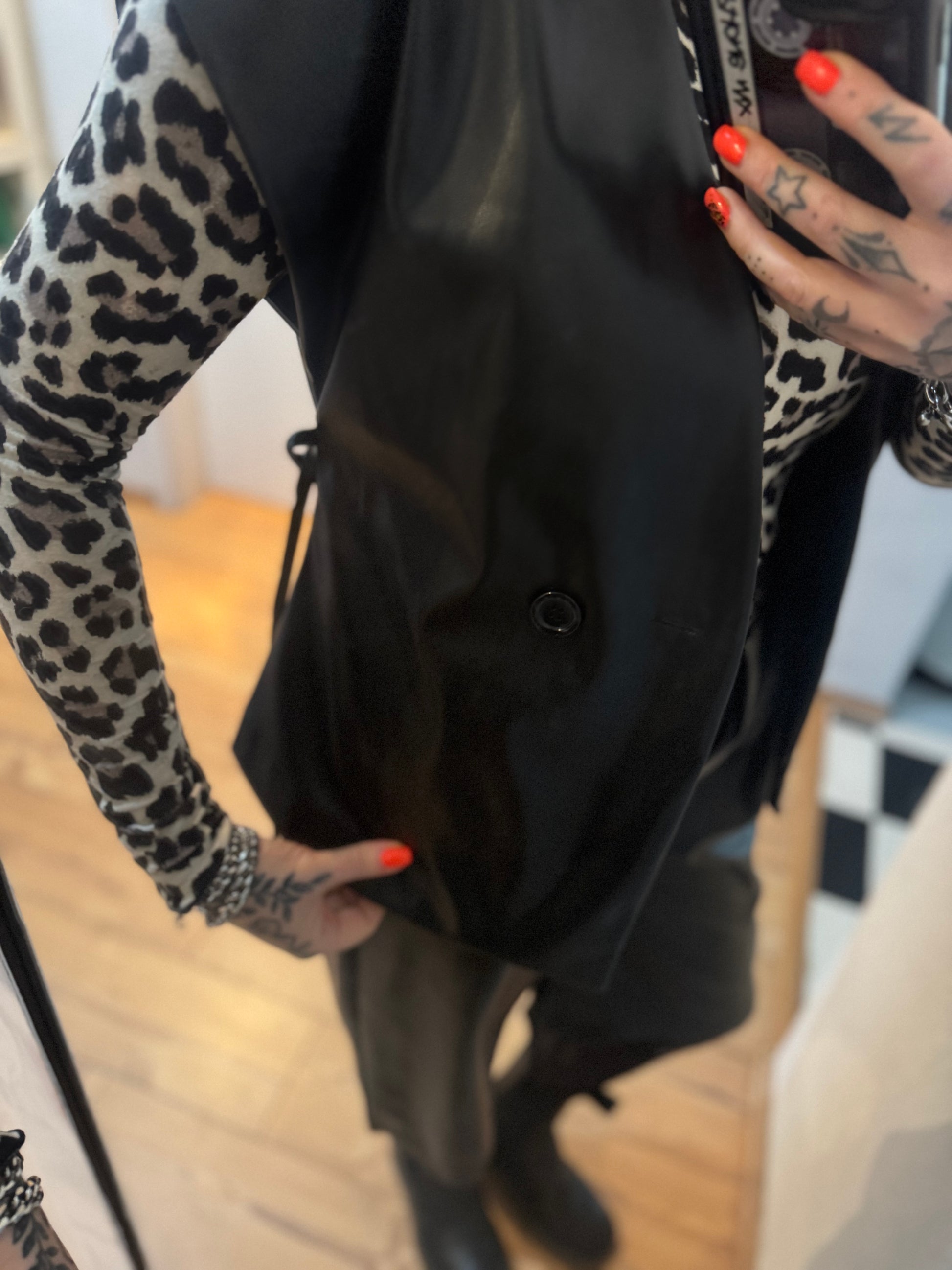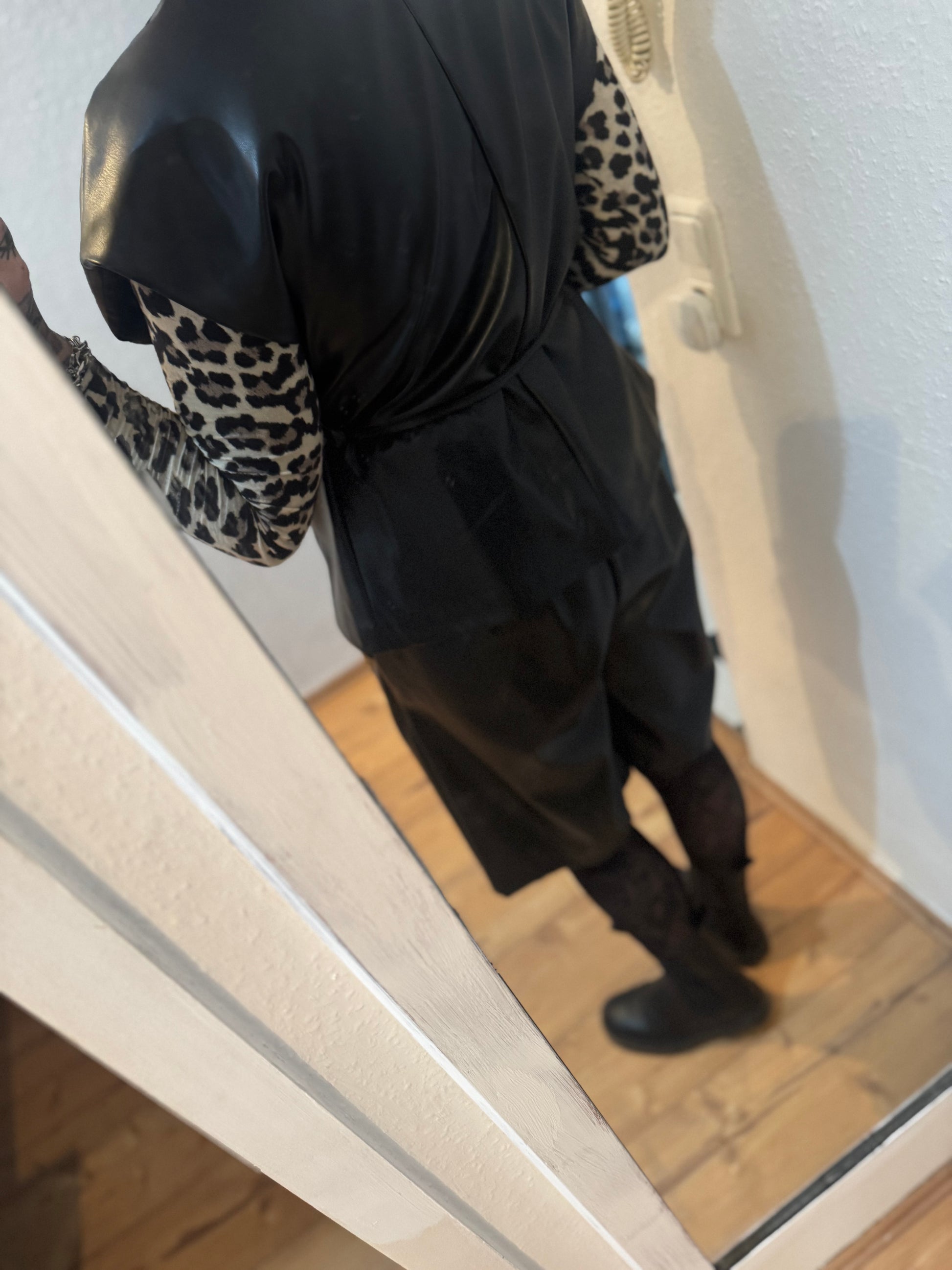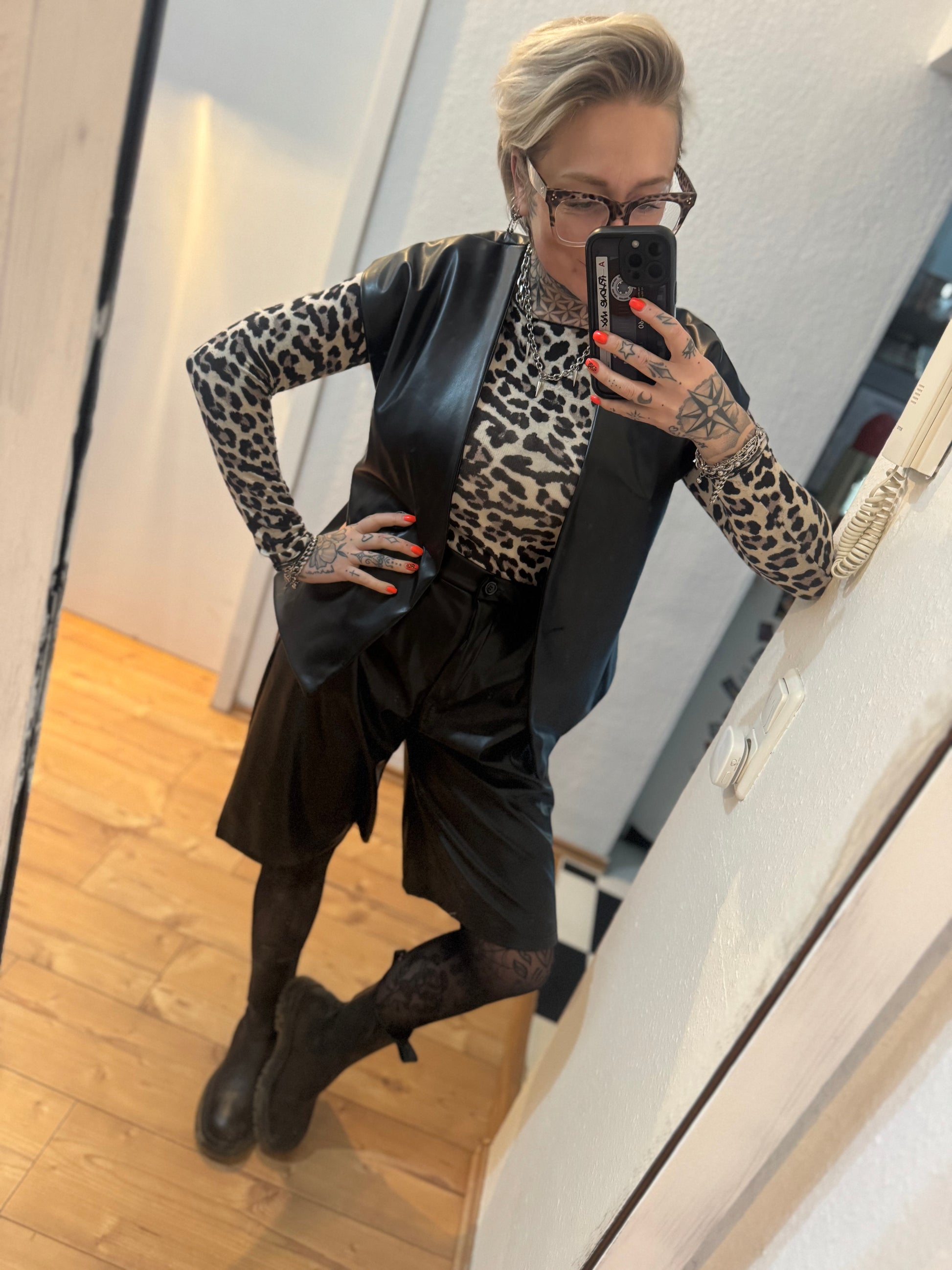 Dieses Set schreit nach Selbstbewusstsein. Der Girlboss Zweiteiler besteht aus einer lässig geschnittenen Bermuda aus veganem Leder und einer passenden Weste, die deinen Look sofort edgy und modern wirken lässt.