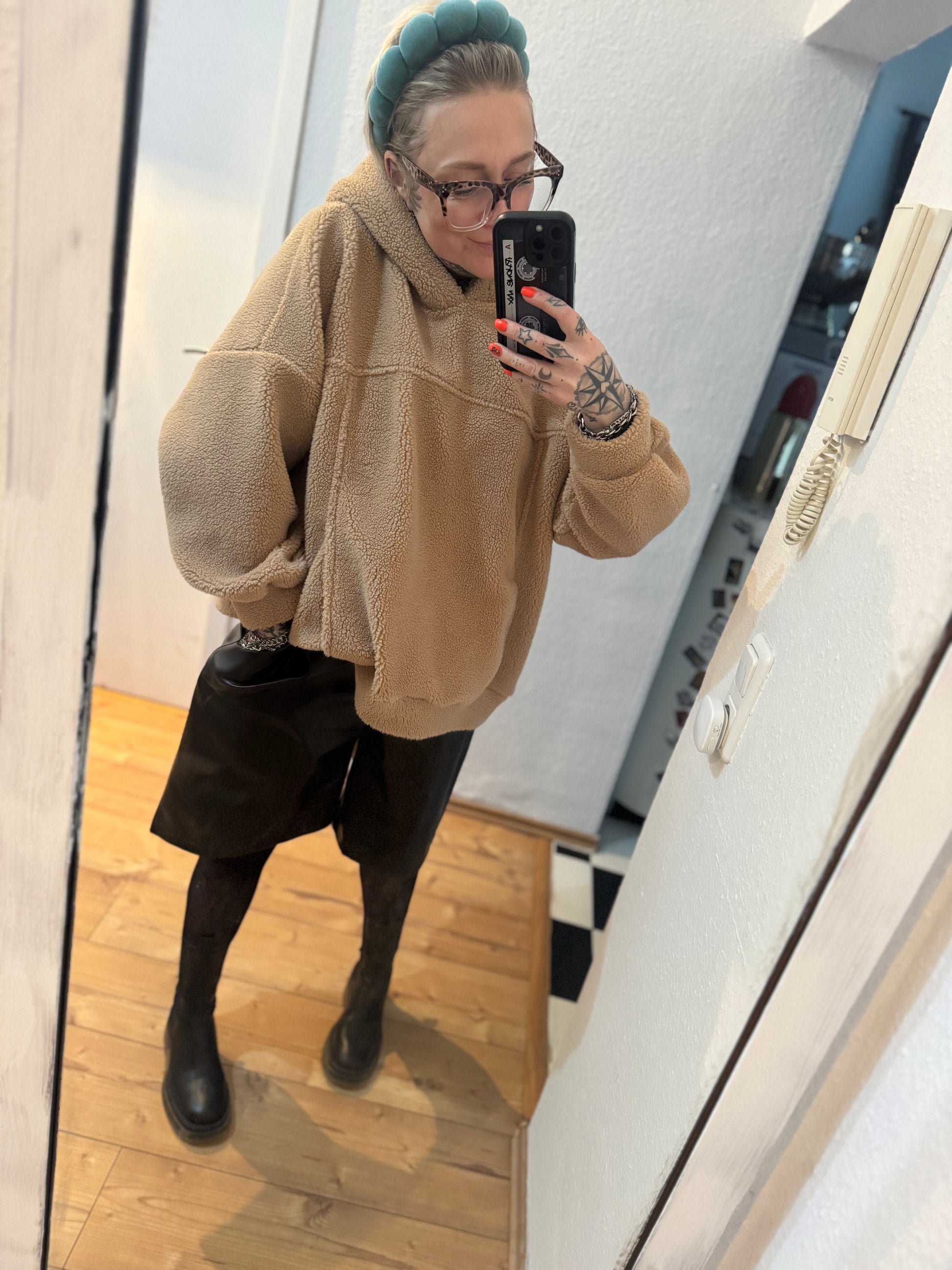 Die Shorts fällt bewusst großzügig aus und sitzt super bequem durch den breiten Gummizug hinten. Vorn hast du Reißverschluss, Knopf und Gürtelschlaufen, sodass du sie perfekt anpassen kannst. Mit Gürtel sitzt sie auch bei einer kleineren Größe perfekt.