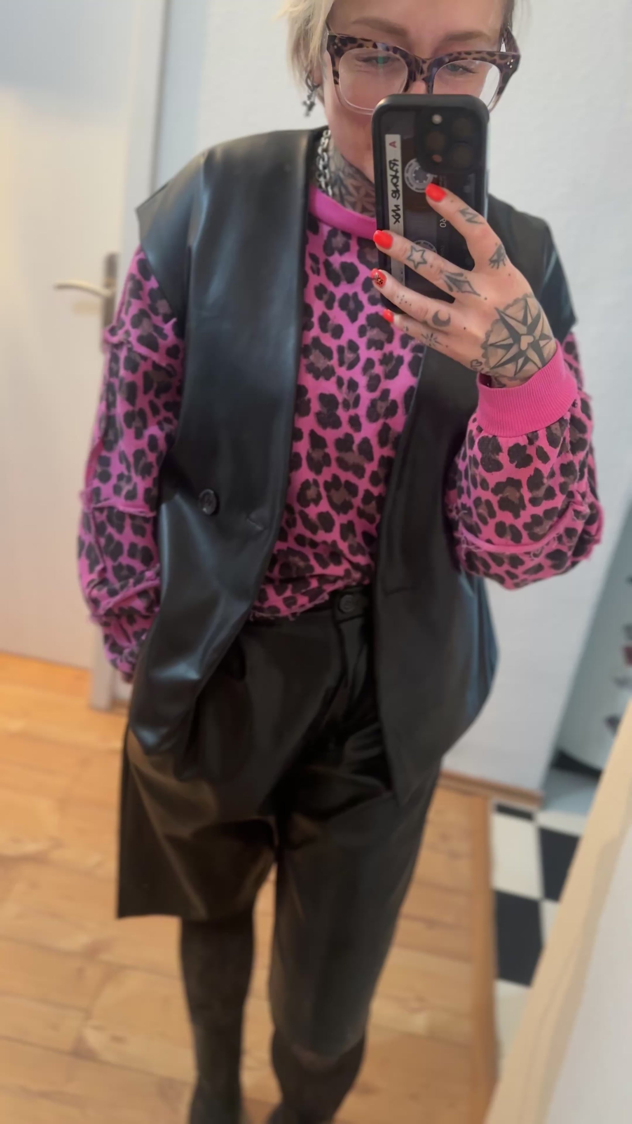 Die Weste rundet das Set ab und bringt diesen „ich weiß genau, was ich tue“-Vibe. Die überschnittenen Ärmel machen den Look modern und cool, ohne dass es zu viel ist.